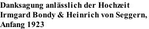 Irmgard Bondy, daughter of  Oscar Bondy ca. 1924 Irmgard Bondy, daughter of Oscar Bondy ca. 1925 Irmgard Bondy, daughter of Oscar Bondy Kiel, Germany, March 1924,  with son Heinz Oscar, my father Irmgard Bondy (von Seggern),  daughter of Oscar Bondy Bremen, Germany, ca. 1960 Danksagung anlässlich der Hochzeit Irmgard Bondy & Heinrich von Seggern,  Anfang 1923 Irmgard Bondy (von Seggern), daughter of Oscar Bondy Hamburg, Germany, 1928,  with daughter Uta (left) (my aunt) and son Heinz Oscar (right) (my father) Oscar  Bondy Heinz Oscar  von Seggern Gerd von Seggern VN  Zimmer Irmgard  Bondy Heinrich von Seggern Uta von Seggern Irmgard Rhode Bruder Bruder Bruder Therese Zimmer,  beloved of  Oscar Bondy; mother of  Irmgard Bondy Irmgard Bondy,  daughter of Oscar Bondy (unmarried born) *16. Okt 1895, Hamburg, Germany + 16 Mrz 1962, Bremen, Germany Meine Großmutter Tochter von Oscar Bondy My grandmother Daughter of Oscar Bondy Irmgard Bondy Irmgard Bondy, in jungen Jahren mit Haushälterin Julia Beuck in Heide Schleswig Holstein Nachfolge Oscar Bondy